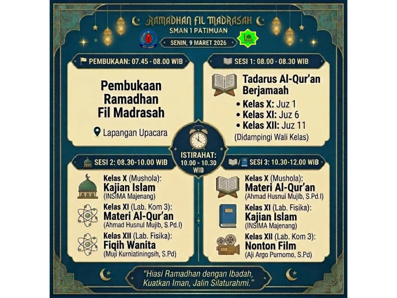 SMA Negeri 1 Patimuan menyelenggarakan kegiatan Ramadhan Fil Madrasah Tahun 2026 yang dilaksanakan pada tanggal 9–13 Maret 2026 sesuai jadwal yang telah ditetapkan. Kegiatan ini bertujuan untuk meningkatkan ...