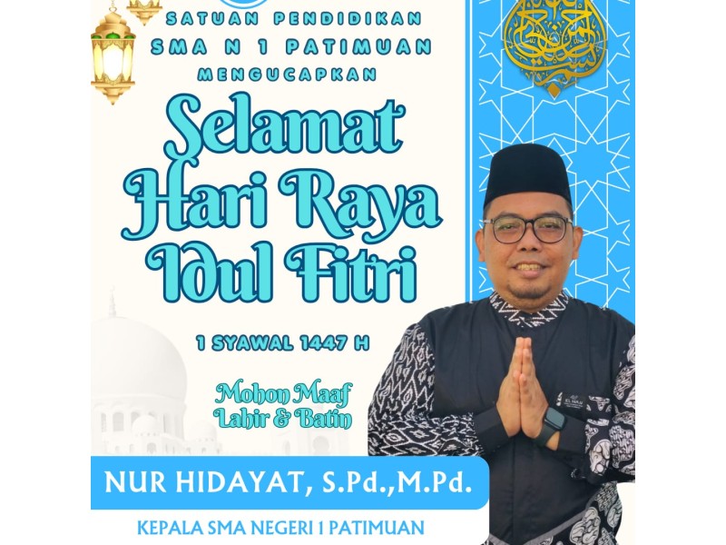 Segenap Keluarga Besar SMA Negeri 1 Patimuan mengucapkan Selamat Hari Raya Idul Fitri 1 Syawal 1447 Hijriah. Taqabbalallahu minna wa minkum, minal aidzin wal faidzin, mohon maaf lahir dan batin. ...